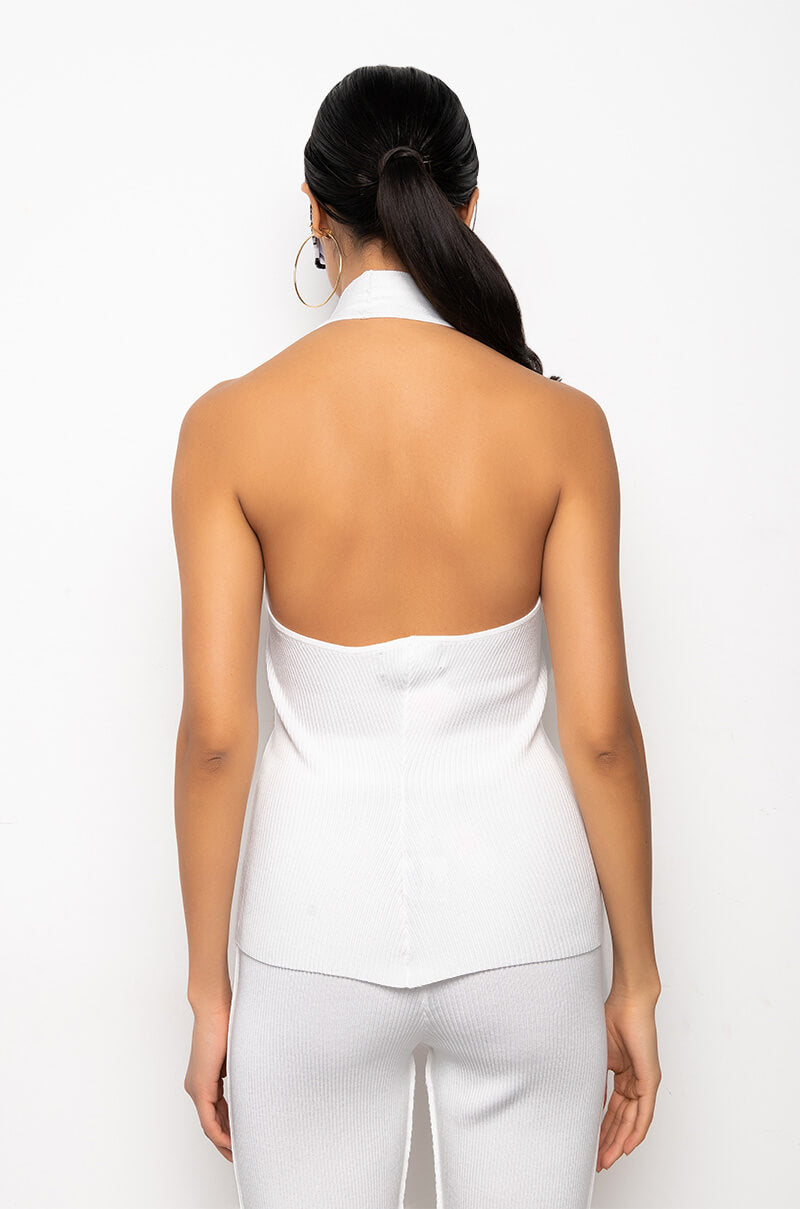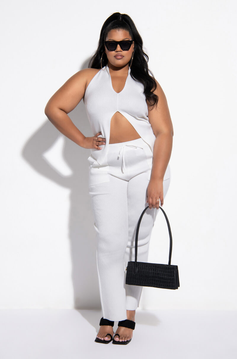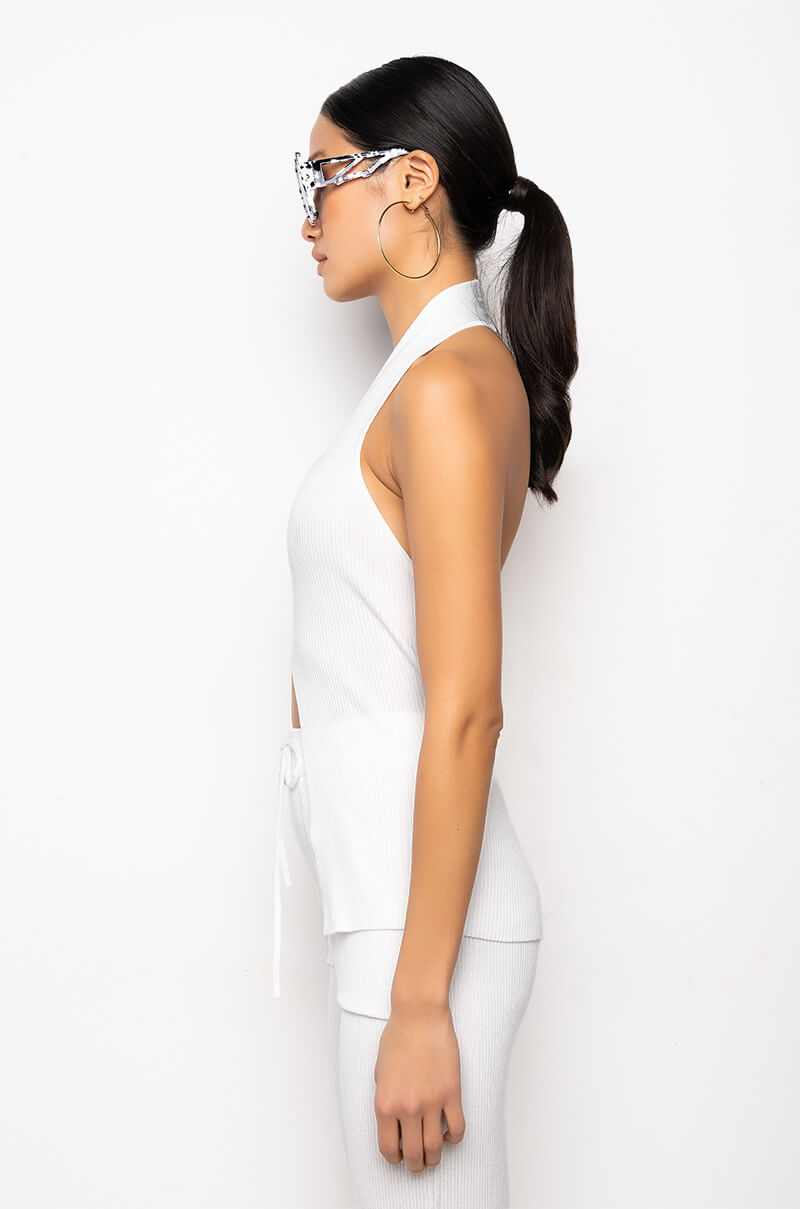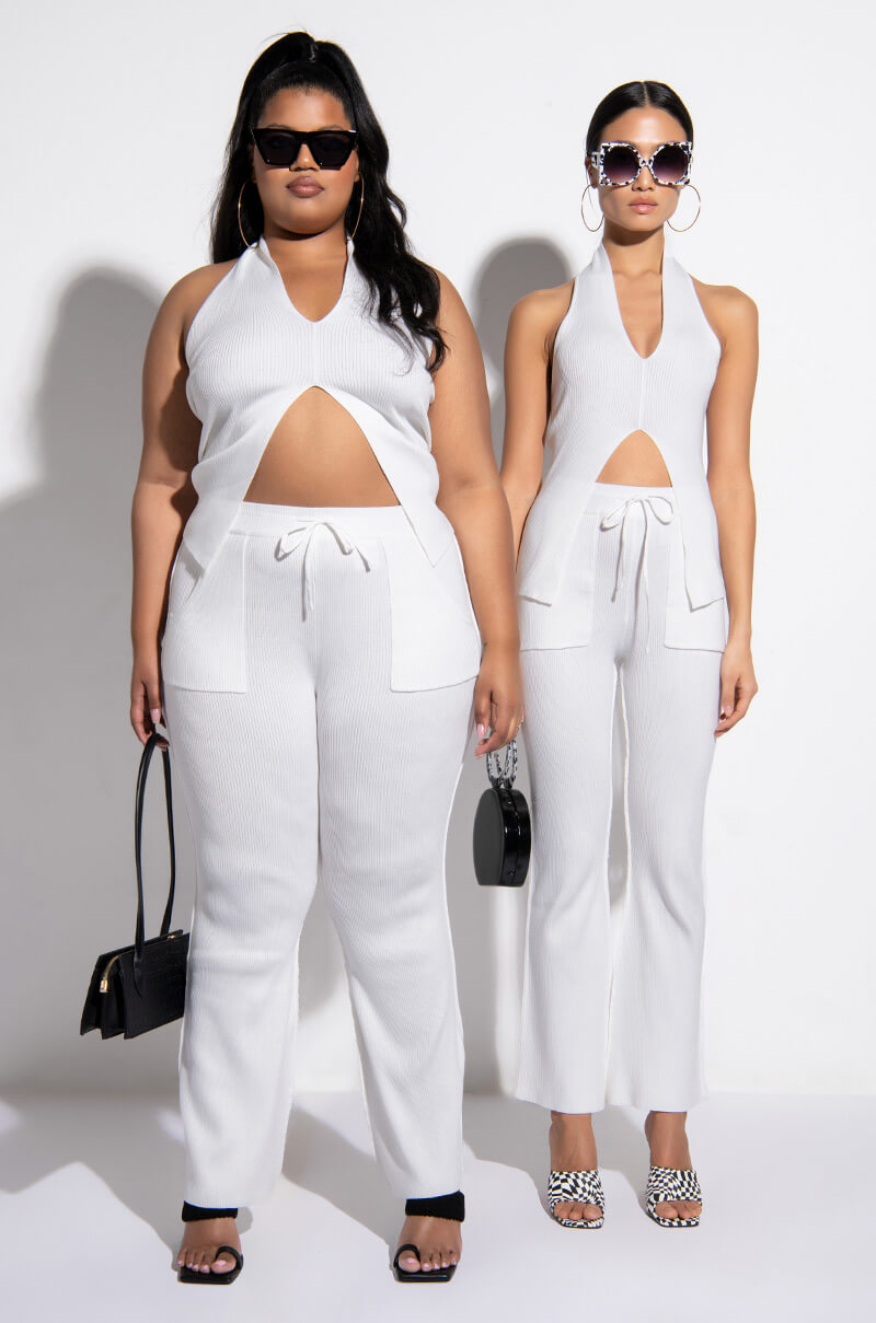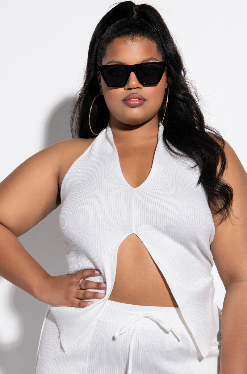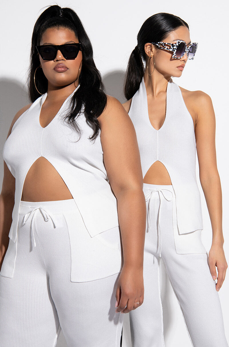 The AKIRA Label Cozy Up Deep V Sleeveless Knit Top is made from a ribbed knit fabrication and is complete with a deep V halter neckline, split hem, and an open back. Style this tank with the matching AKIRA Label Cozy Up Knit Flare Legging to complete your cozy cute look!