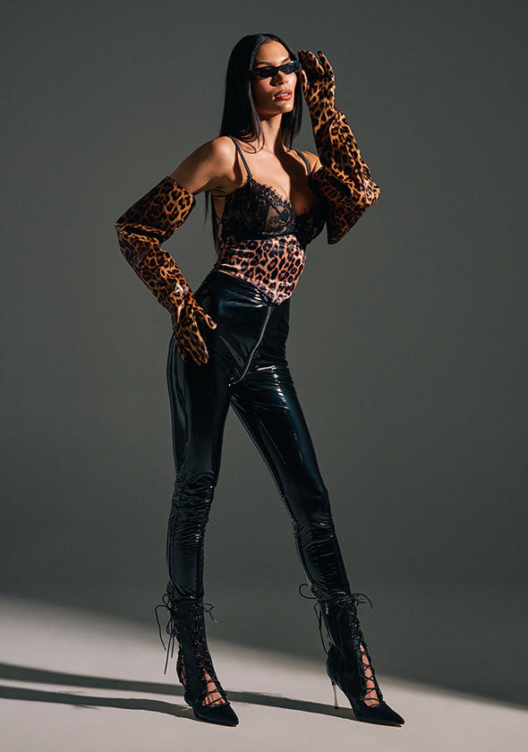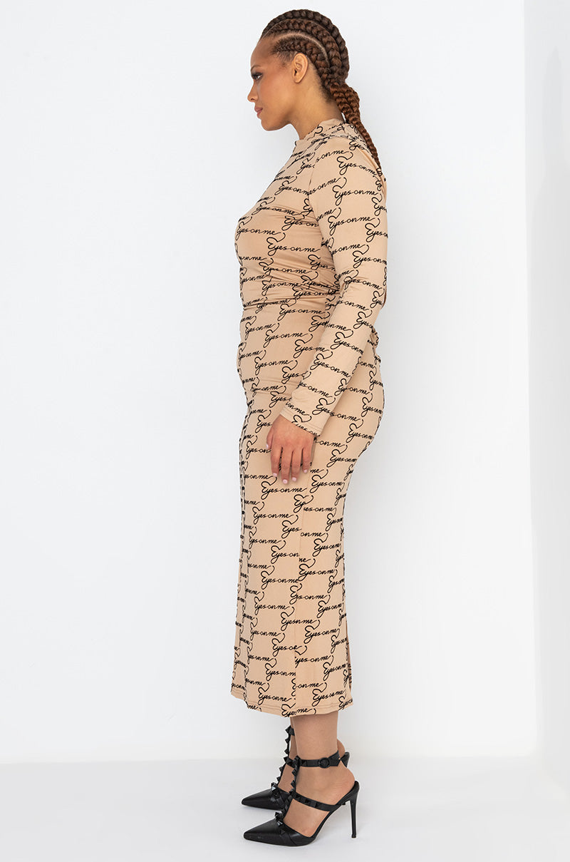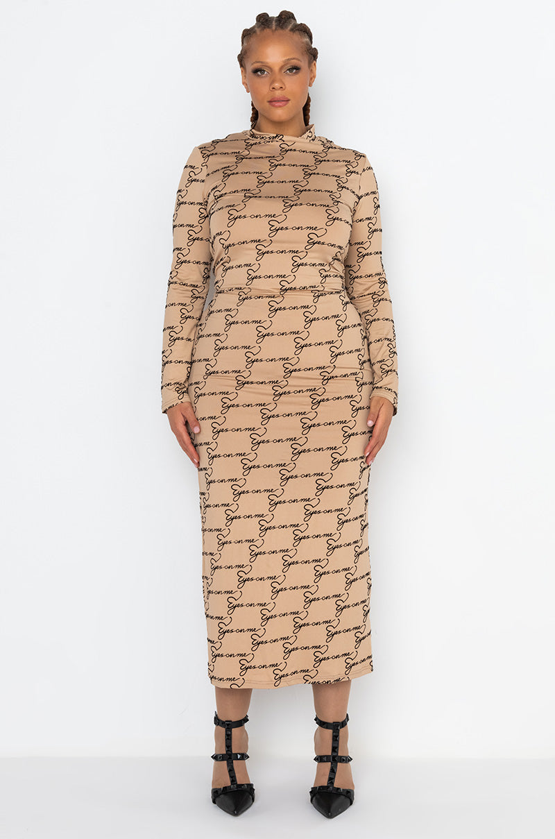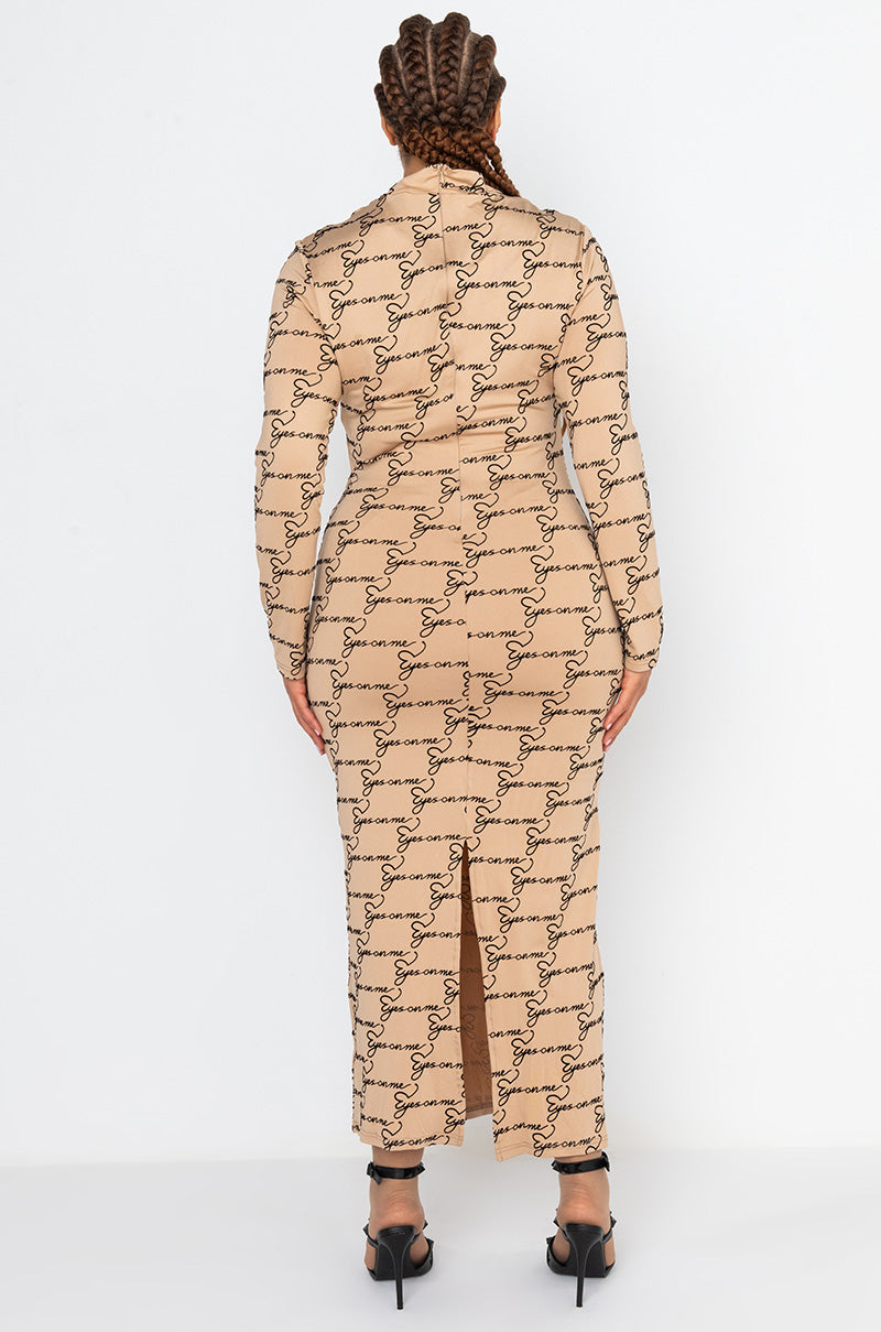 The AKIRA Label Plus All Eyes On Me Mock Neck Maxi Dress features a stretch knit bodycon fabrication, “Eyes on Me” velvet script print, mock neckline, long sleeves, maxi length, calf slit opening, and hidden back zipper closure.