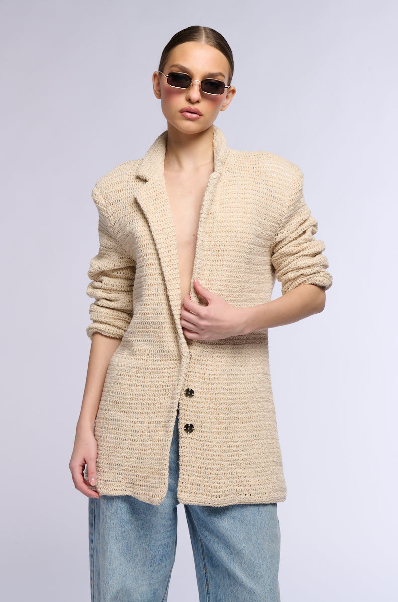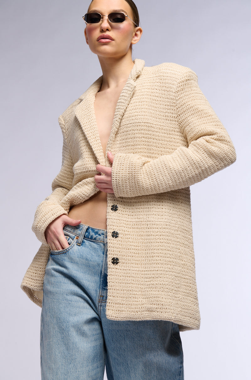 Providing classy, sophisticated style in The AKIRA Label Classic Oversized Crochet Blazer. This longline piece features an intricately crocheted knit outer shell, a notch lapel collar, a plunging neckline, padded shoulders for natural shaping, long sleeves, and cotton linen inner lining. Complete with an oversized, longline silhouette, and concealed faux silver metallic snap button front closures. Style with neutral-toned mini dresses and satin pumps for a finished ensemble.